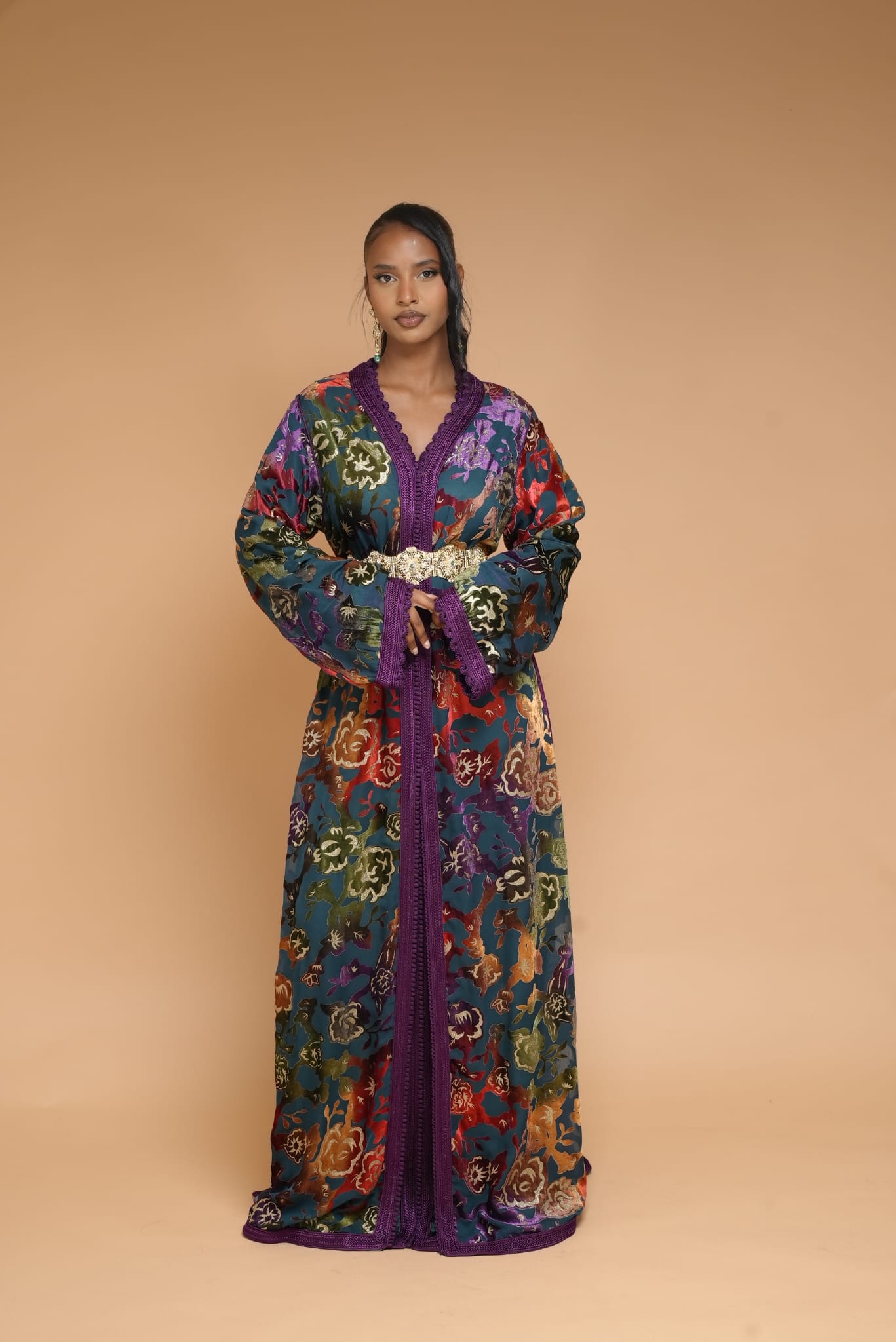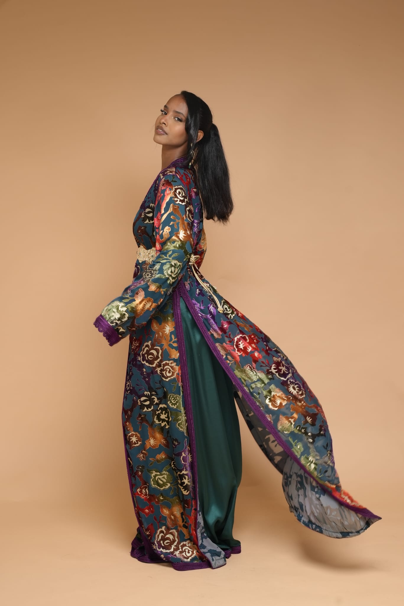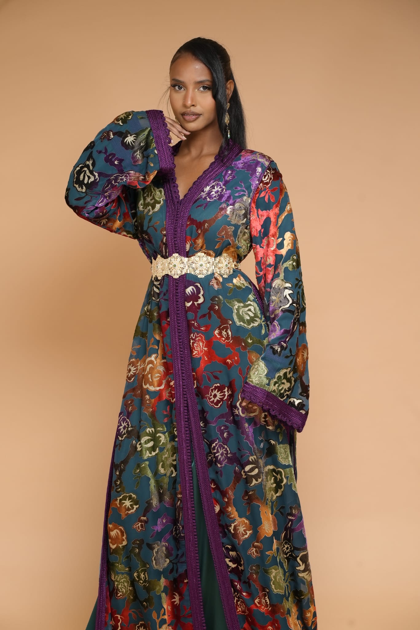 - Takchita 2 pièces d'un beau vert sapin et reliefs colorés en velours.