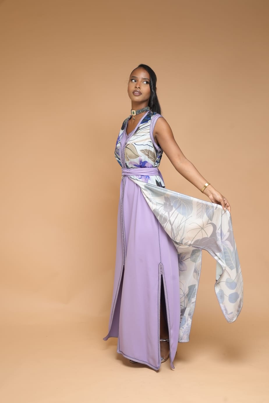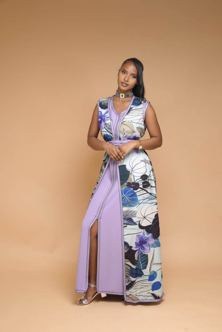 - Takchita 2 pièces. Faite d'un joli tissu floral dans les tons bleus et lilas. Pour un look élégant et champêtre