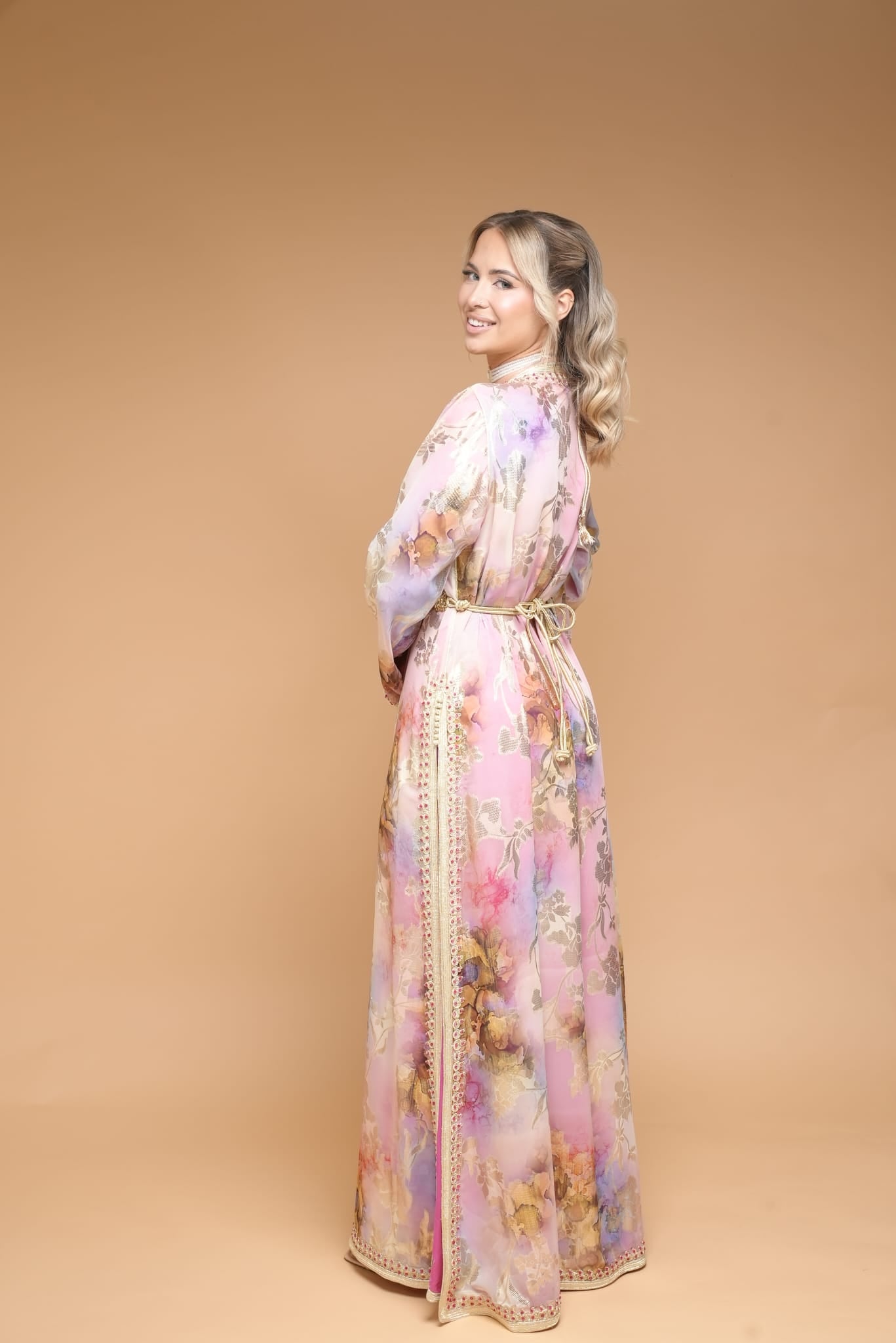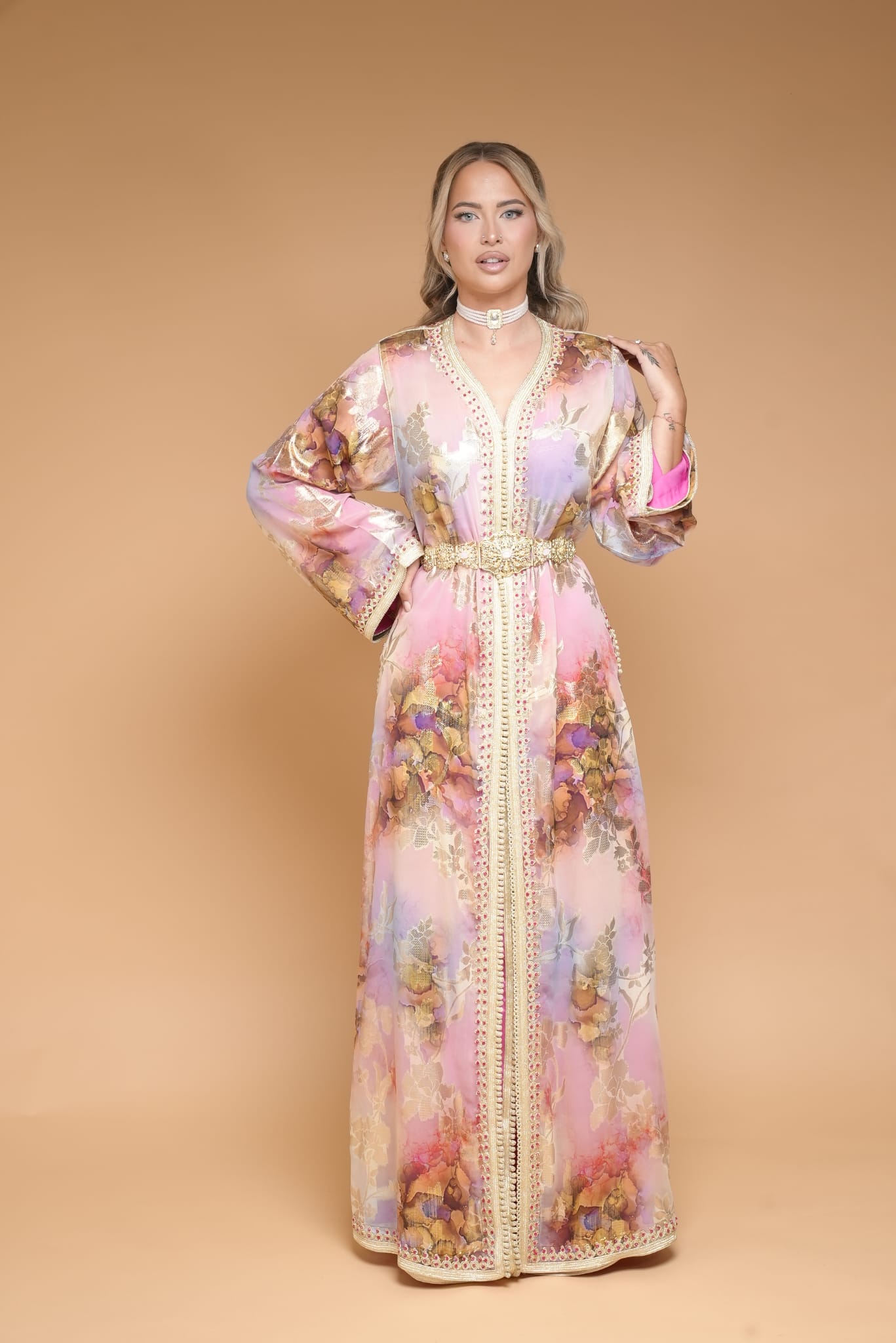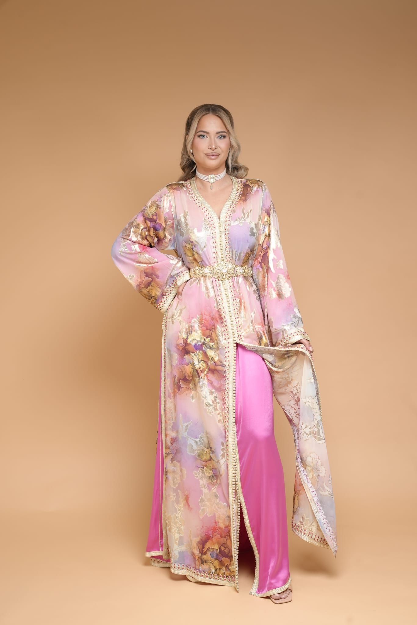 - Takchita 2 pièces en tissu tlija rosé très coloré.